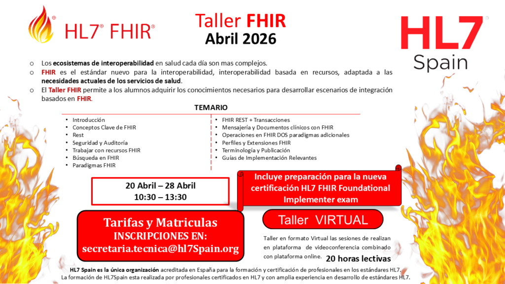 NUEVA CONVOCATORIA TALLER FHIR HL7 ABRIL 2026 Mar 13, 2026 | Formación, HL7Spain, Noticias y Actualidad, Portada